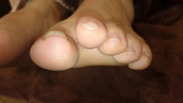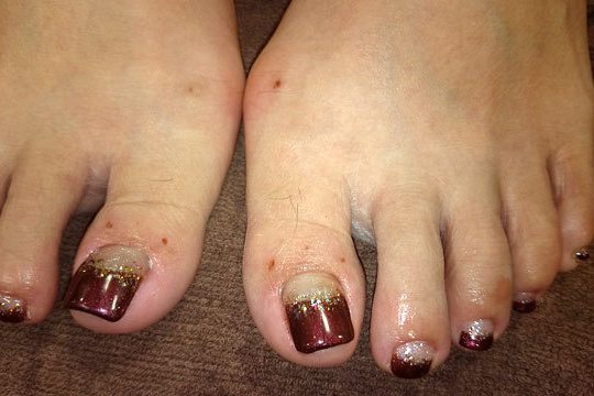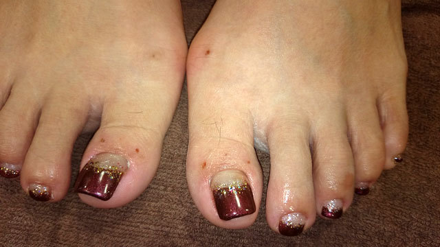 対策:スカルプチュアというアクリルの素材で足の爪に長さを出しました。まき爪で痛いということでしたので、爪のカーブを広げ固定しました。痛みがなくなったと喜ばれました