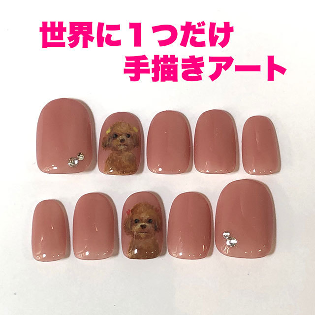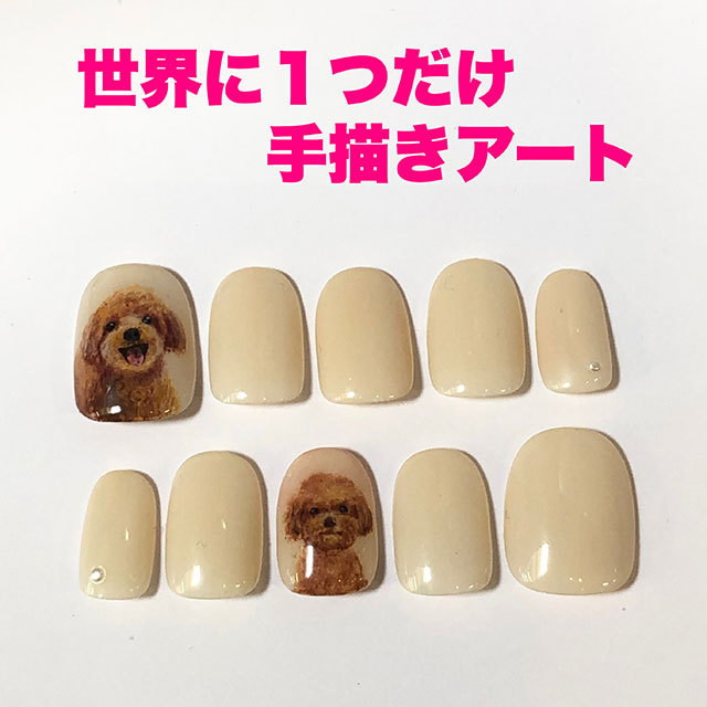 肌馴染みの良いオフホワイトのネイルチップにプードルのイラストです。