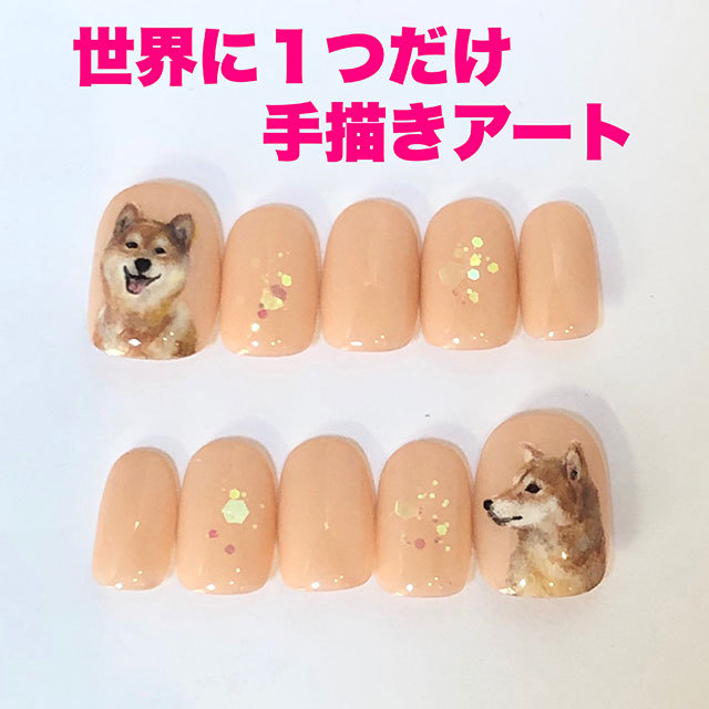 肌馴染みの良いベージュのネイルチップにポメラニアンのイラストです。